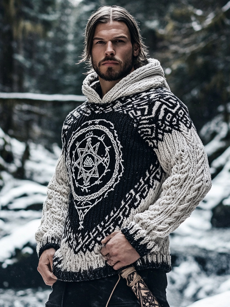 Men's Viking Tribal Jacquard Celtic Knotwork Vintage Rune Inspired Chunky Knit Hooded Sweater