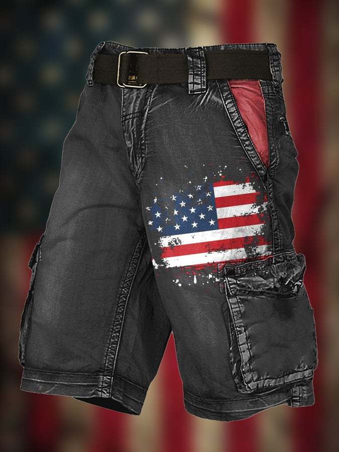 Men's Vintage Flag Independence Day Multi-Pocket Print Cargo Shorts (Belt Not Included)