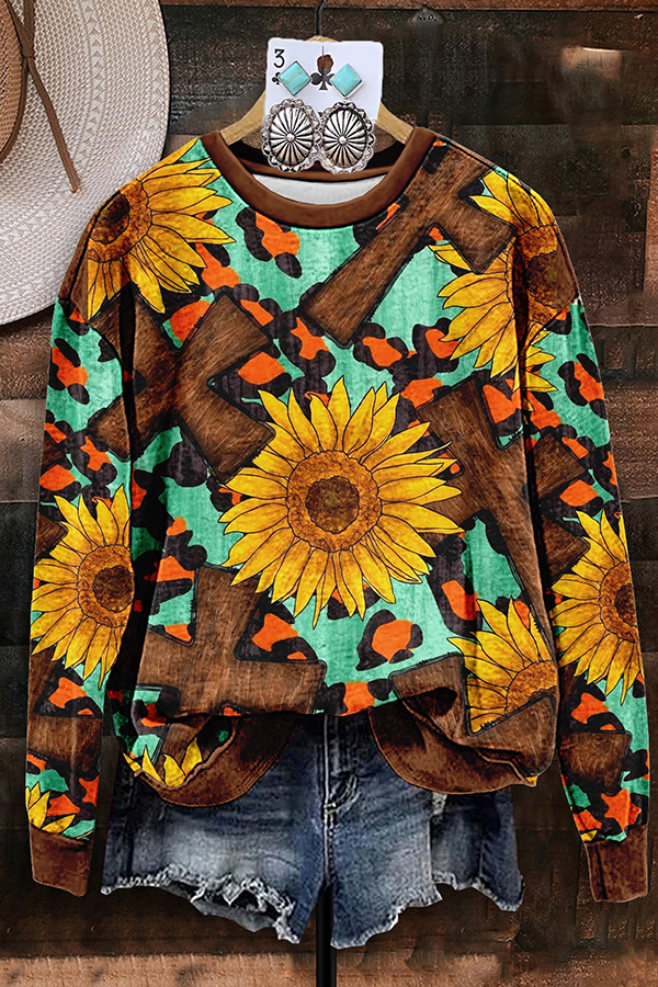 Vintage Sunflower Cross Leopard Print Sweatshirt