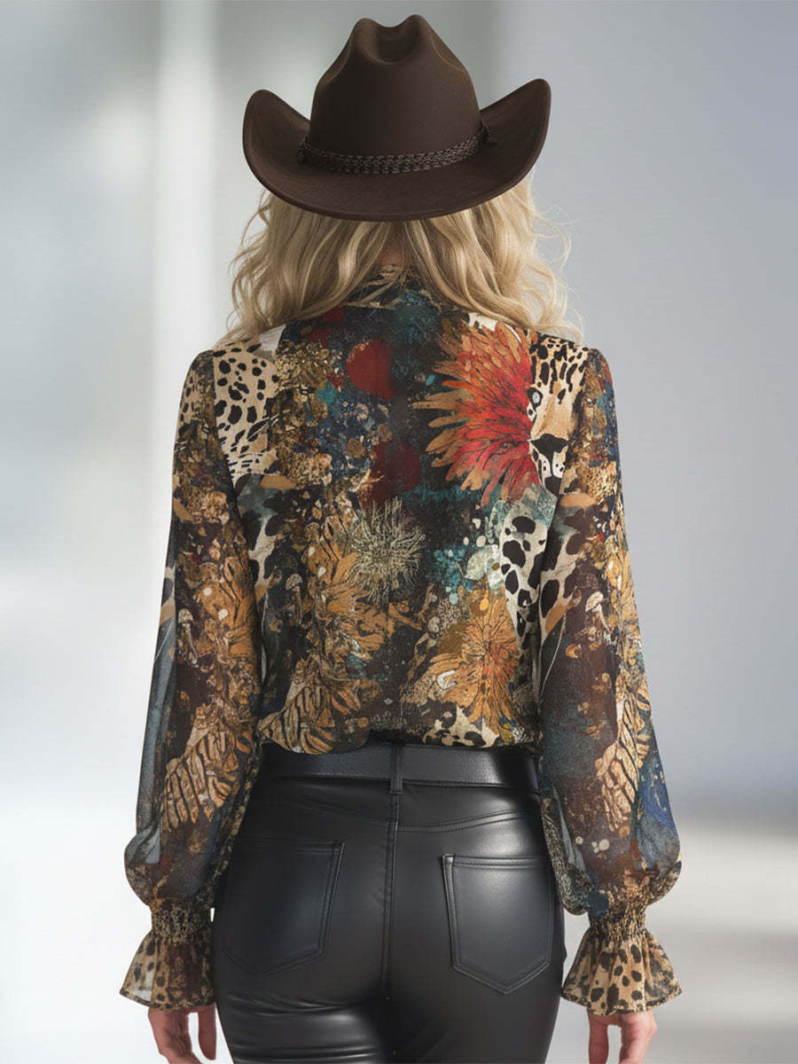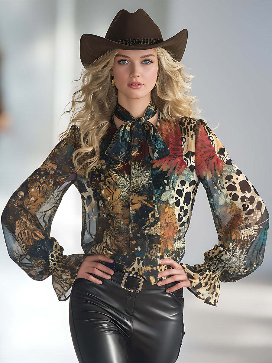 Retro-chic Art Print Chiffon Ribbon Shirt