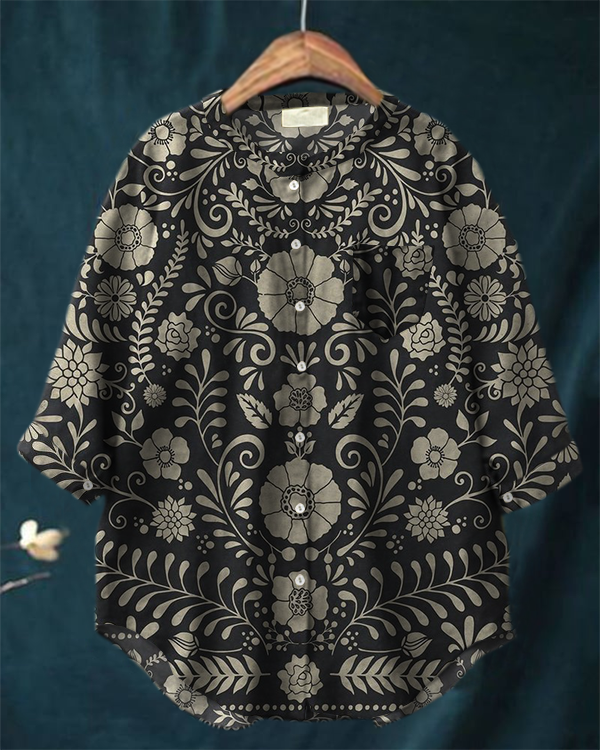 Retro Ethnic Floral Print Stand Collar Long Sleeve Cotton and Linen Shirt