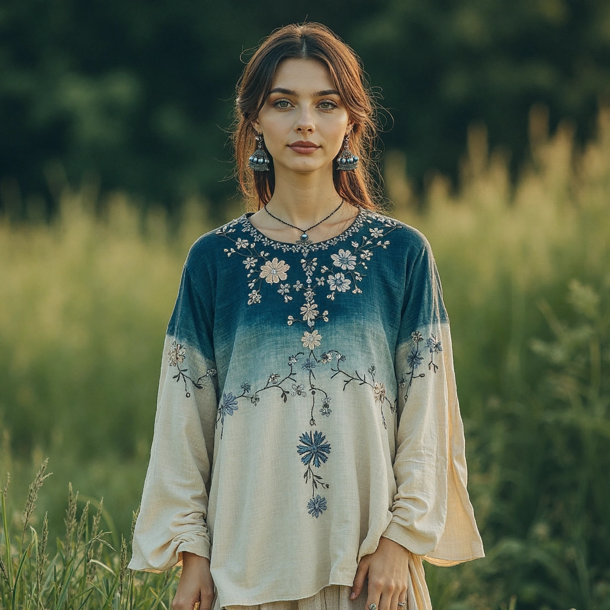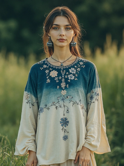 Retro Gradient Floral Embroidery Linen Blend Long Sleeve T-shirt