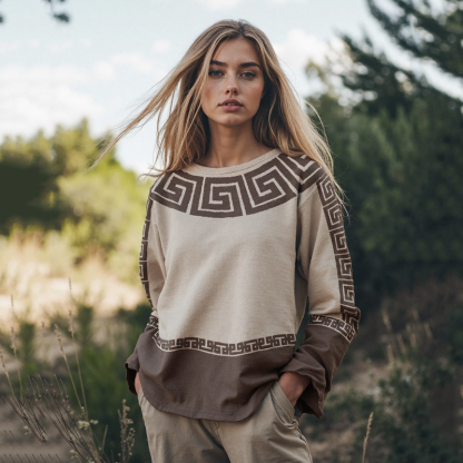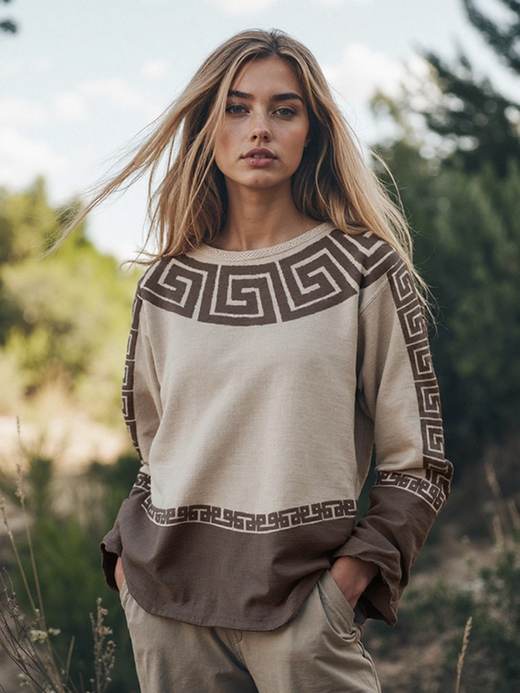Retro Greek Key Pattern Art Linen Blend Long Sleeve T-shirt
