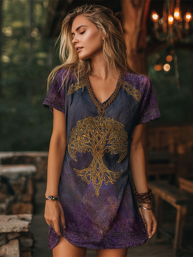 Retro Viking Tree Of Life Embroidery Women's Linen Short Sleeve V-neck Mini Dress