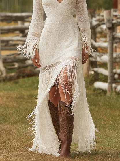 Retro White Lace V-neck Long Sleeve Tassel Short Front And Long Back Skirt Maxi Dress