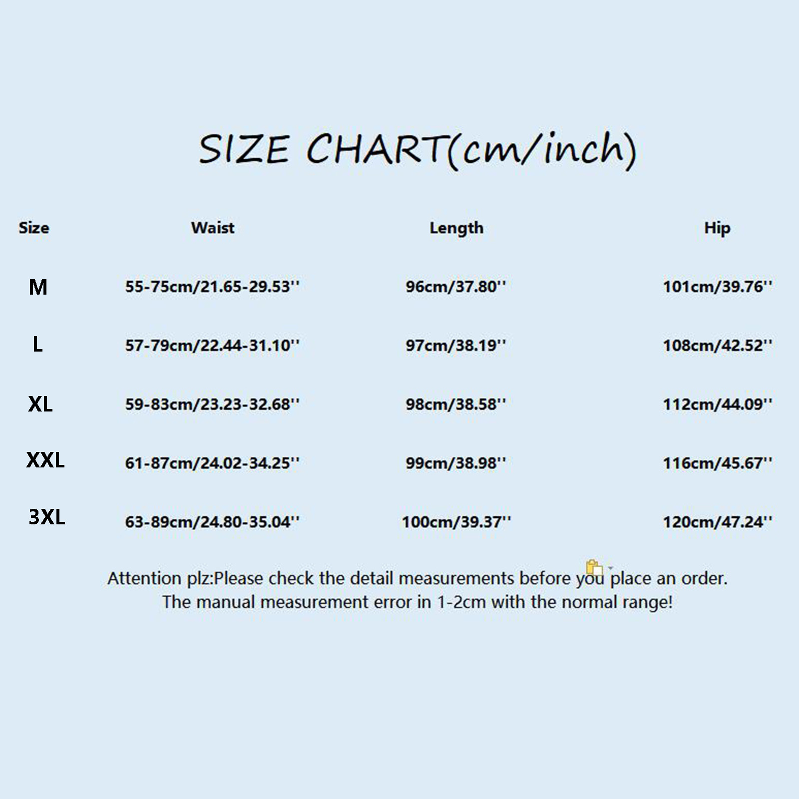 | Size:3XL | Waist:63-89cm/24.80-35.04'' | Hip:120cm/47.24'' | Length:100cm/39.37'' |