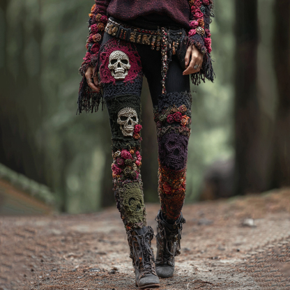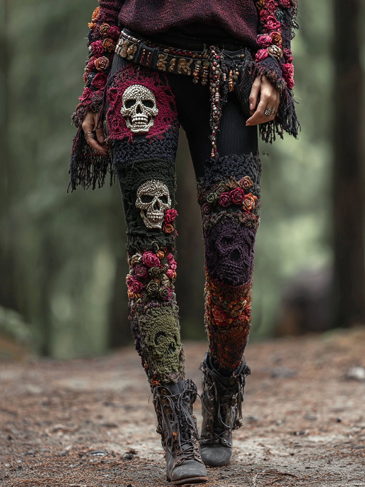 Rose And Skull Gothic Wool Patchwork Print Leggings