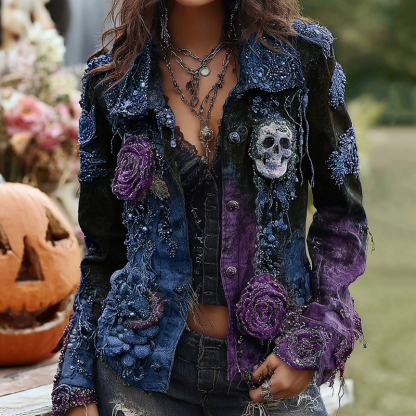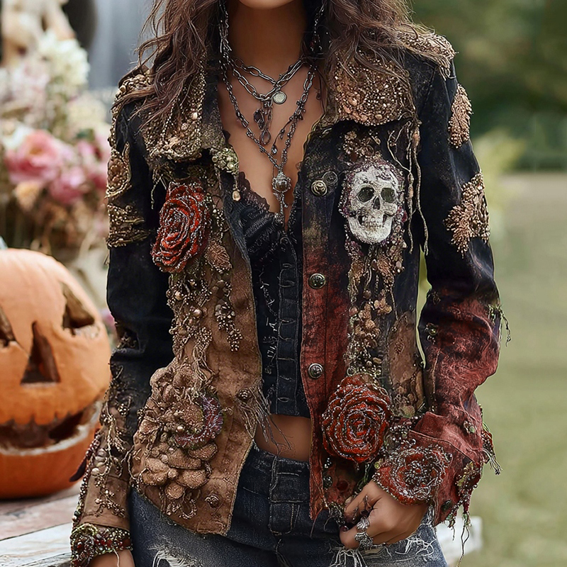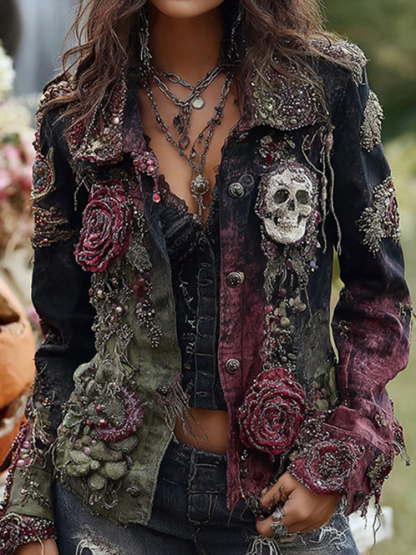 Rose Skull Embroidered Gothic Rough-contrast Denim Jacket