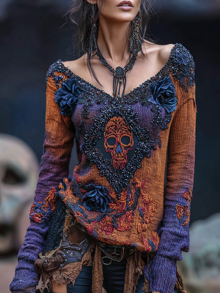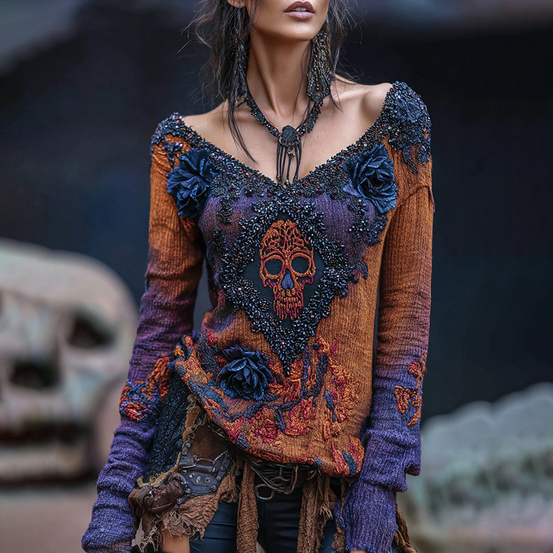 Rose Skull Rhinestone Contrast V Neck T-shirt