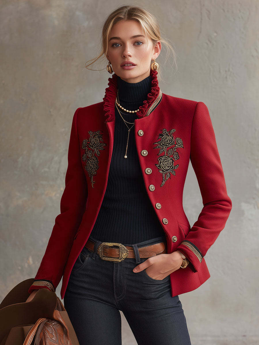 Ruffled Stand-up Collar Single-breasted Rose Embroidered Woolen Jacket