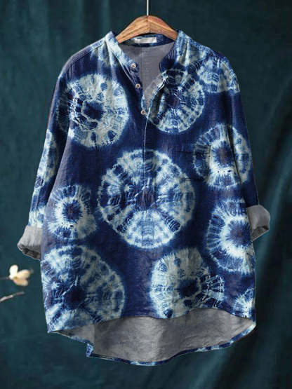 Shibori Tie Dye Pattern Printed Women's Casual Long Sleeve Comfortable Cotton Shirt