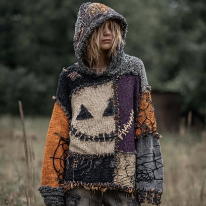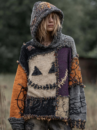 Spooky Face And Spider Web Patchwork Design Cozy Halloween Knit Hooded