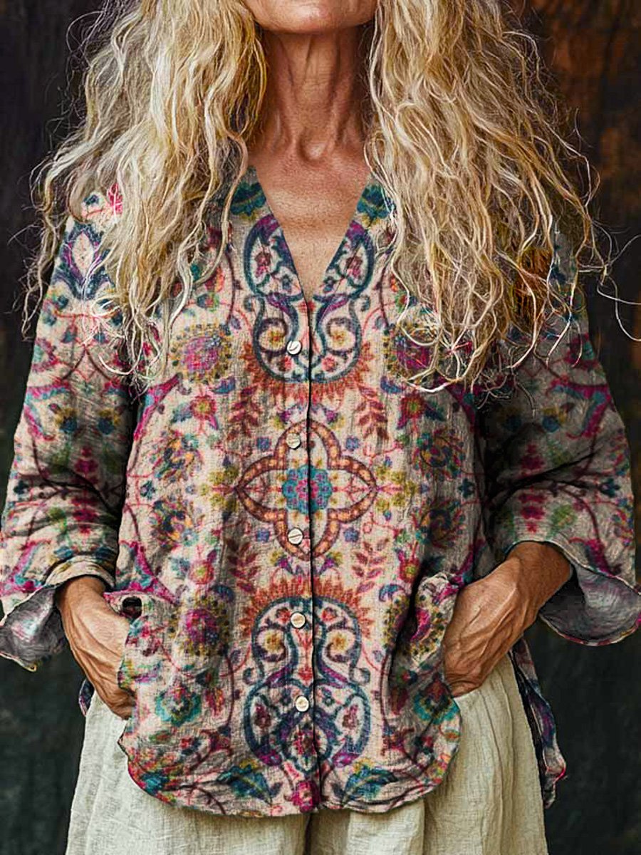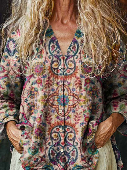Symmetrical Ethnic Pattern Printed Women's Linen And Cotton V-Neck Casual Shirt