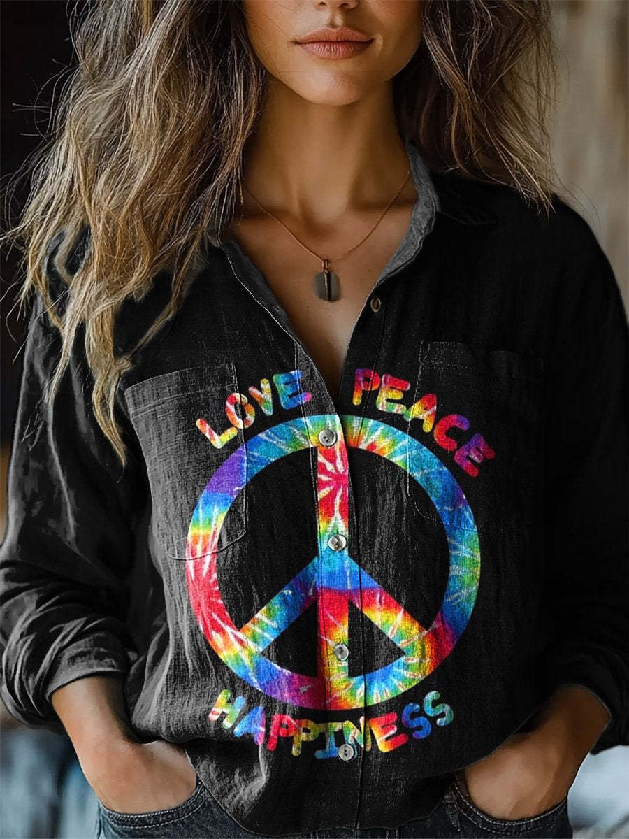Tie Dye Hippie Peace Sign Art Printed Women's Casual Long Sleeve Comfortable Cotton Shirt