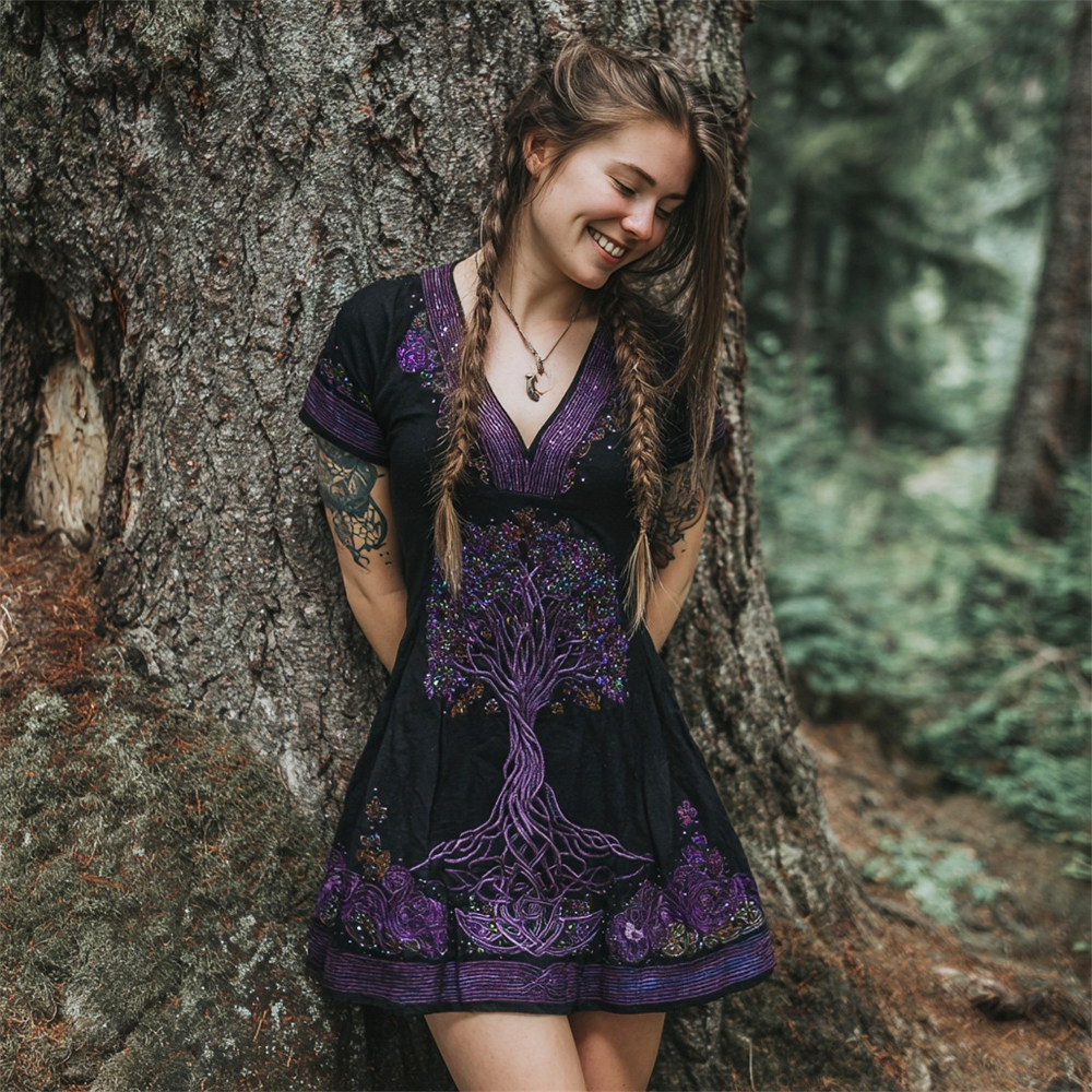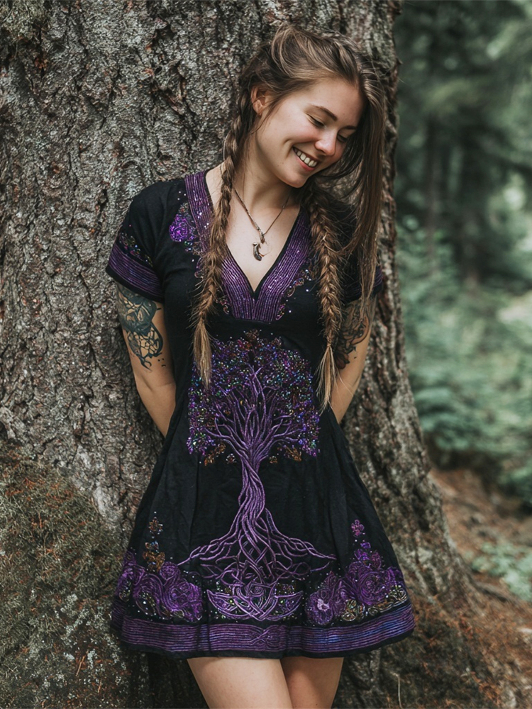 Tree Of Life Boho Floral Sequin Embroidery Women's Linen V Neck Mini Dress