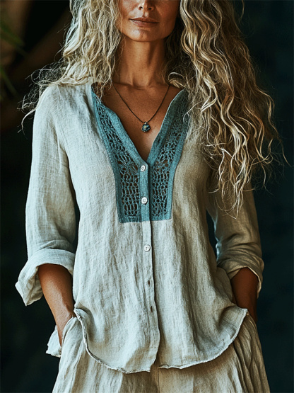 Turquoise Hollow Floral Patchwork Linen Blend Blouse