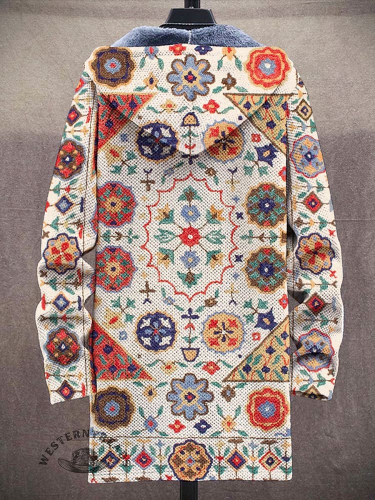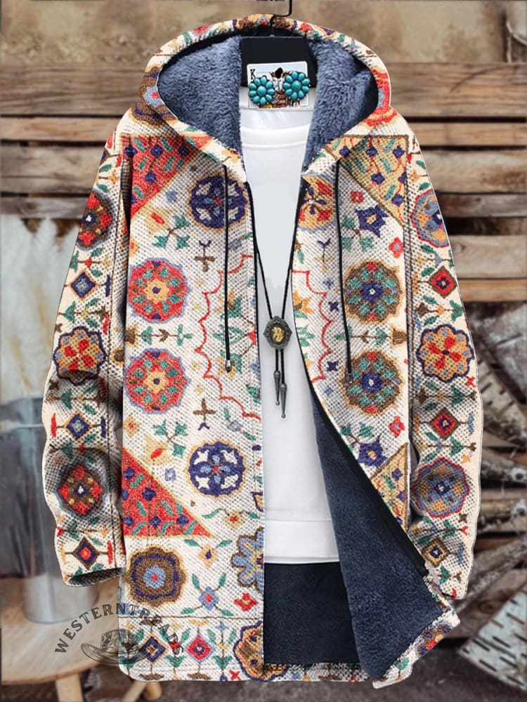 Unisex Retro Tribal Graphic Symmetrical Pattern Texture Print Plush Thickened Long Sleeve Cardigan Jacket