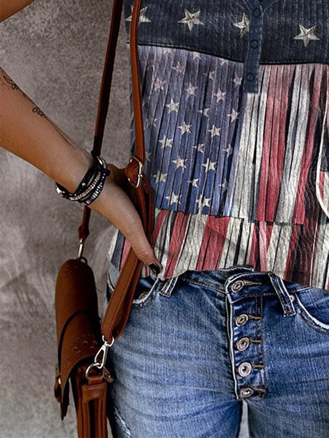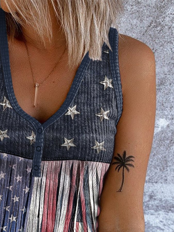 V-Neck Retro Independence Day Flag Color Block Rivets Tassel Print Tank Top