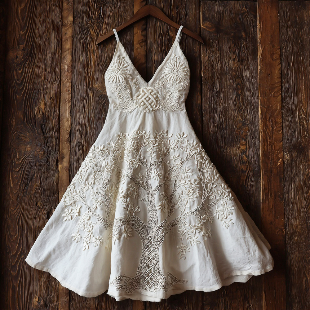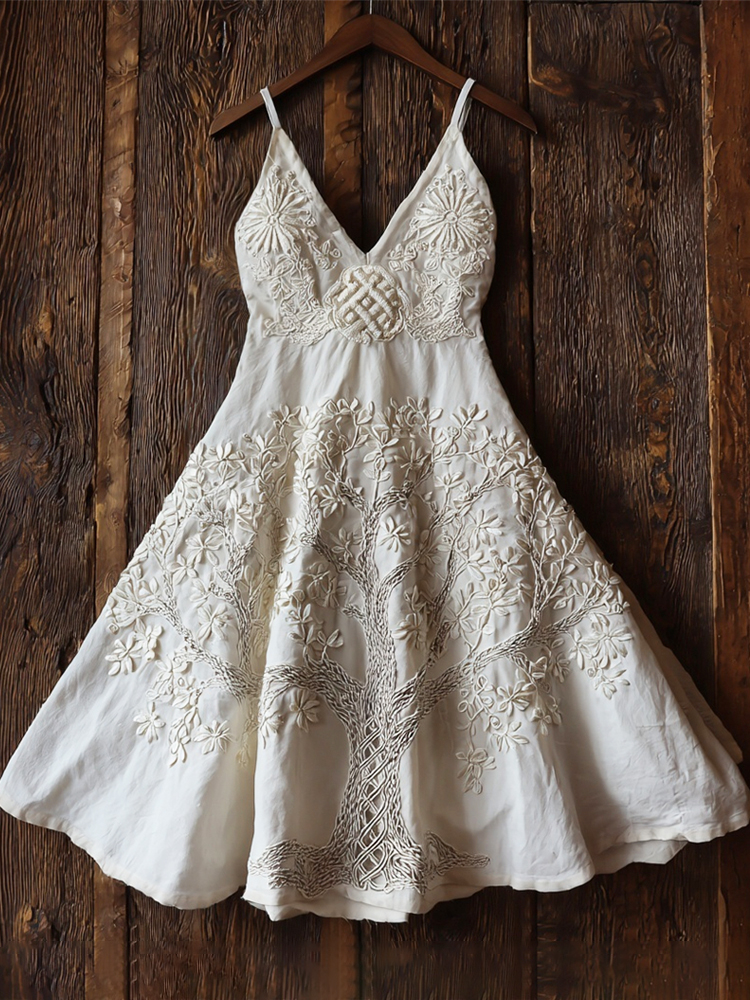 Viking Tree Of Life Embroidered Women's Linen V-neck Spaghetti Strap Midi Dress