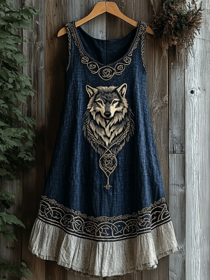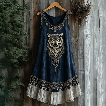 Viking Wolf Pattern Patchwork Tank Midi Dress