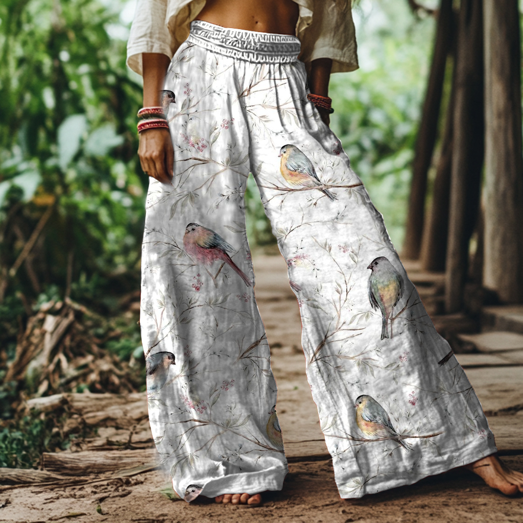 Vintage Bird and Branch Art Print Loose Pants