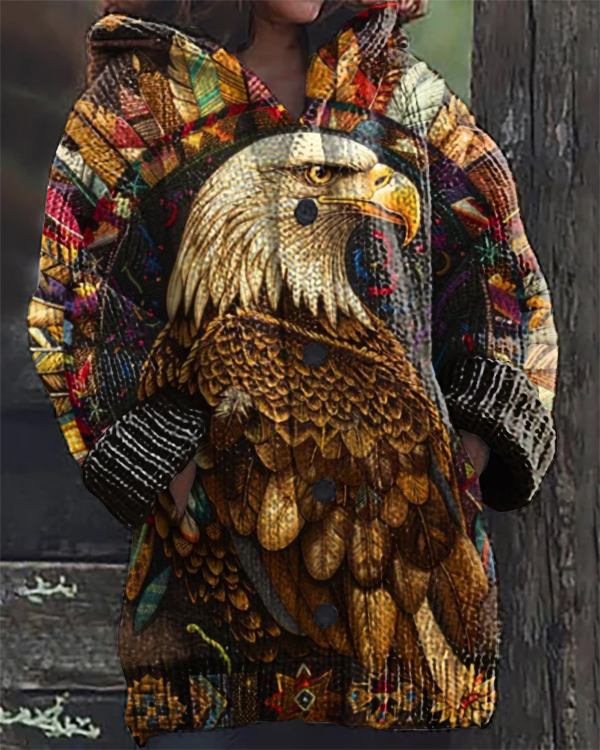 Vintage Eagle Native American Print Hooded Cardigan