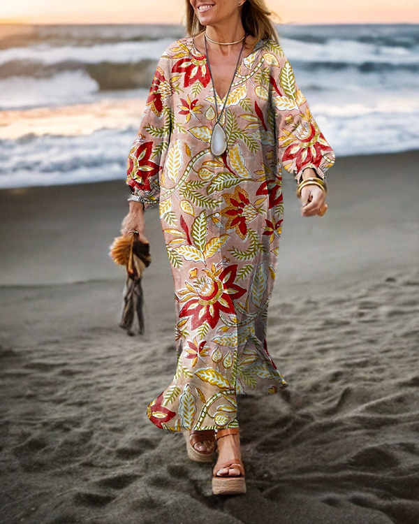 Vintage Ethnic Floral Long-sleeved Cardigan Dress
