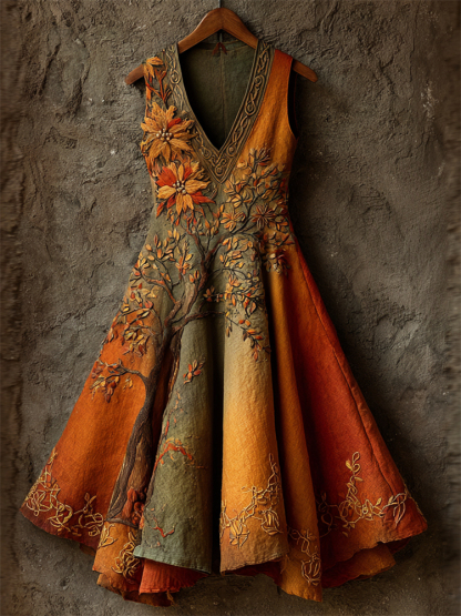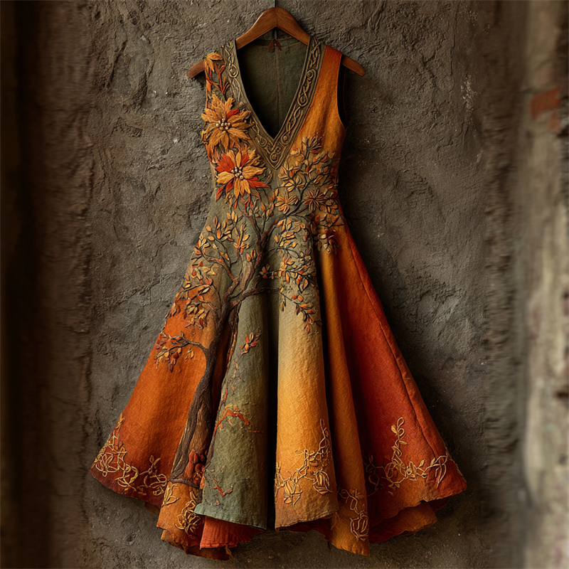 Vintage Fall Floral Tree Of Life Celtic Embroidered Dyed Linen Dress