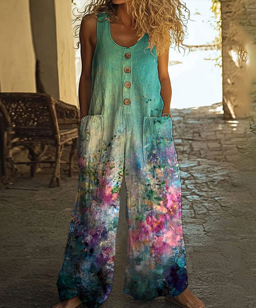 Vintage Floral Art Print Casual Wide Leg Jumpsuit