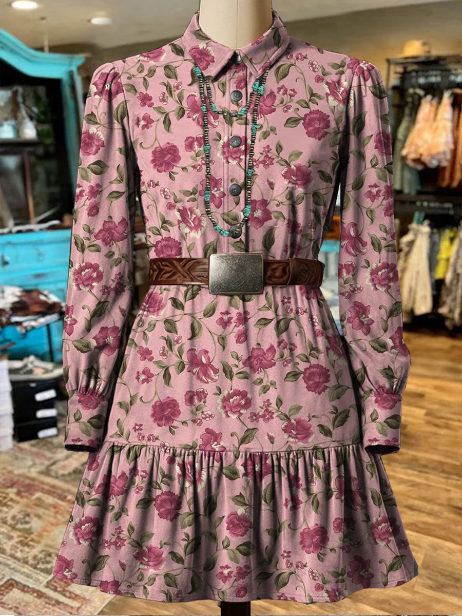 Vintage Floral Print Casual Long Sleeved Lapel Dress