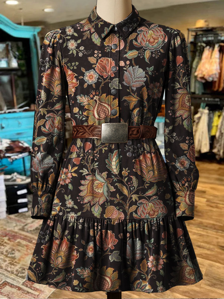 Vintage Floral Print Casual Long Sleeved Lapel Dress