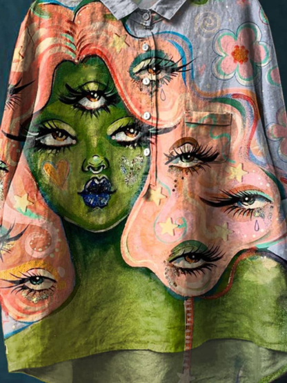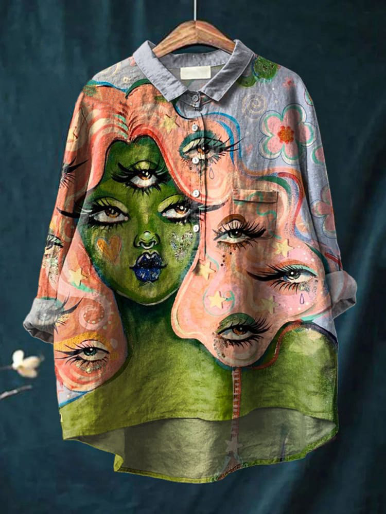 Vintage Funny Painting Art Print Casual Cotton And Linen Shirt