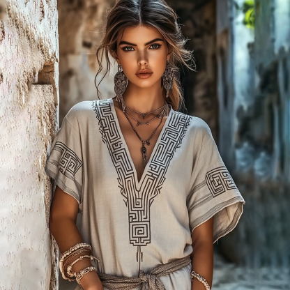 Vintage Greek Key Cotton Linen Contrast Shirt
