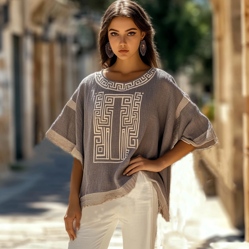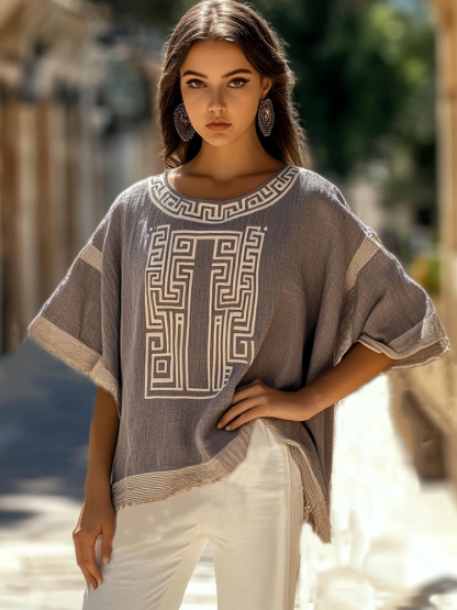 Vintage Greek Key Crew Neck Linen Blend T-shirt
