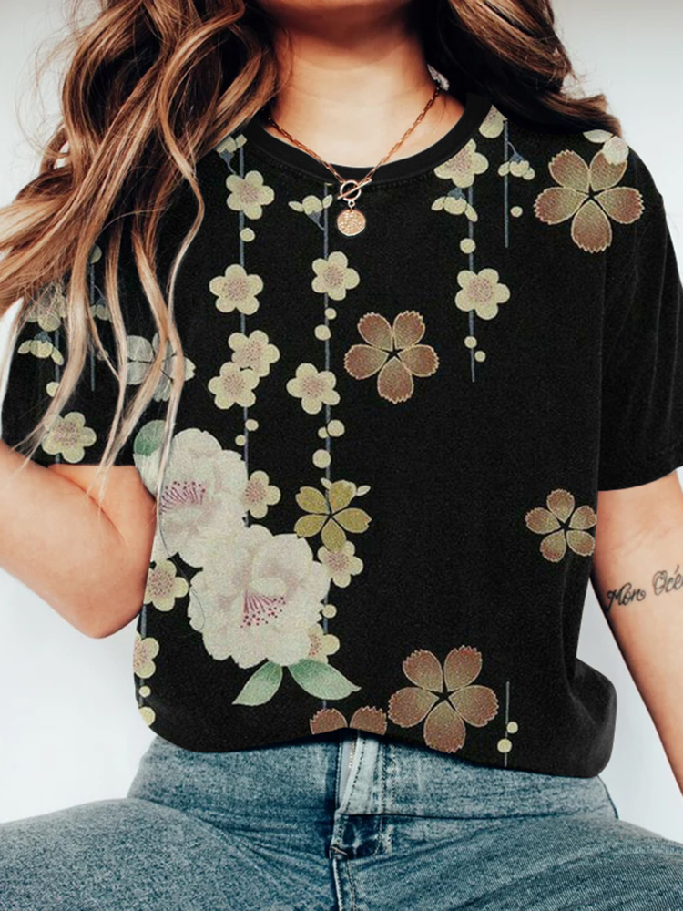 Vintage Japanese Art Plum Blossom Round Neck T-Shirt