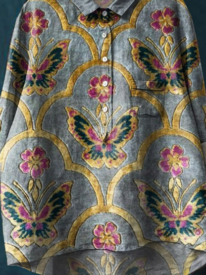 Vintage Lovely Butterflies Art Print Casual Cotton And Linen Shirt