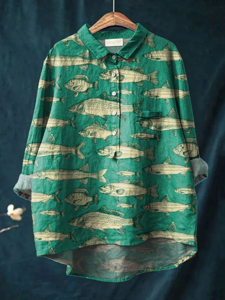 Vintage Lovely Fish Art Print Casual Cotton And Linen Shirt