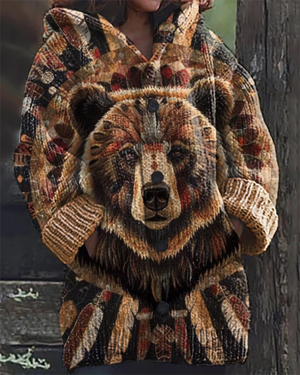 Vintage Native American Bear Print Slouchy Hooded Cardigan