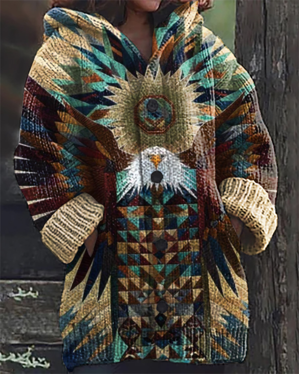 Vintage Native Eagle Print Casual Hooded Cardigan