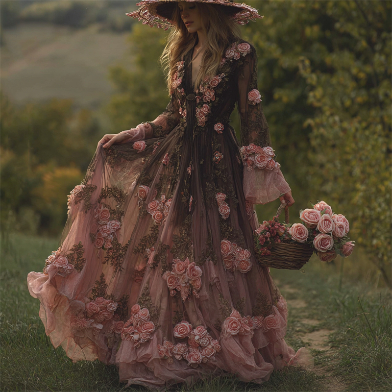 Vintage Pink Roses Gradient Flowy Maxi Dress