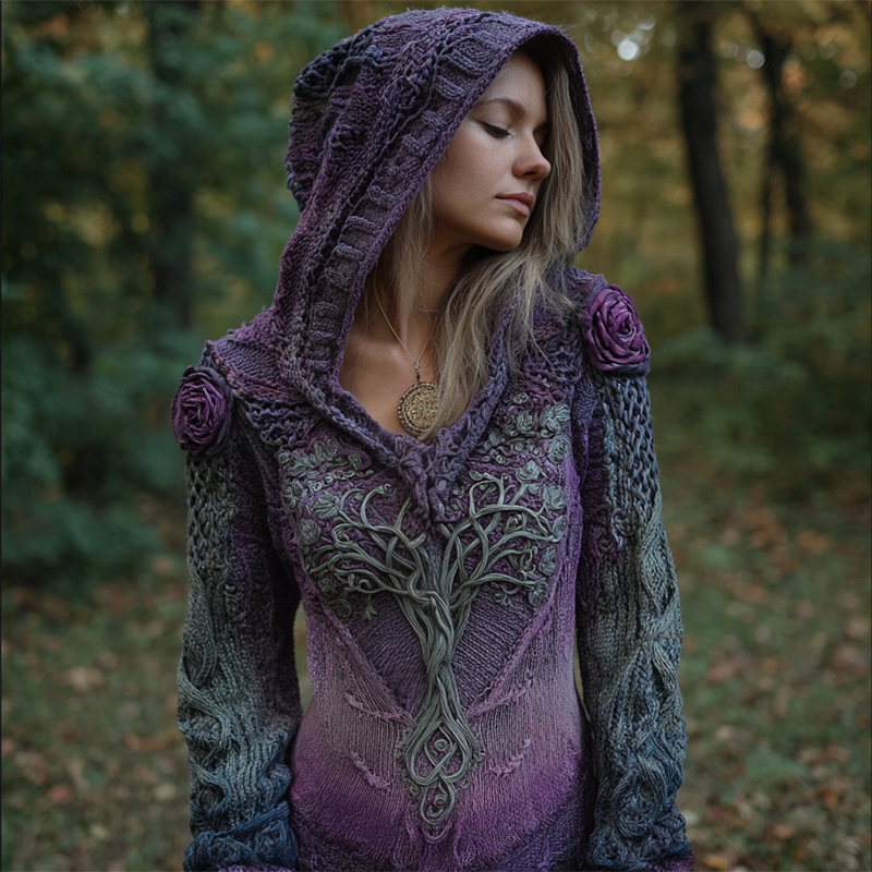 Vintage Purple Roses Tree Of Life Gradient Cozy Hooded Sweater