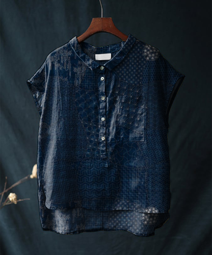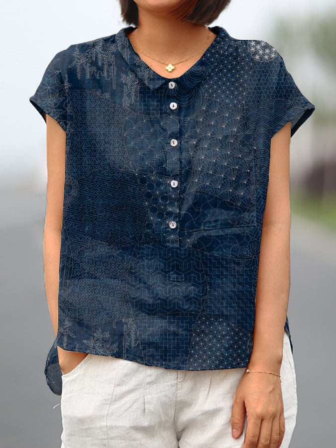 Vintage Sashiko Printed Cotton and Linen Casual Shirt