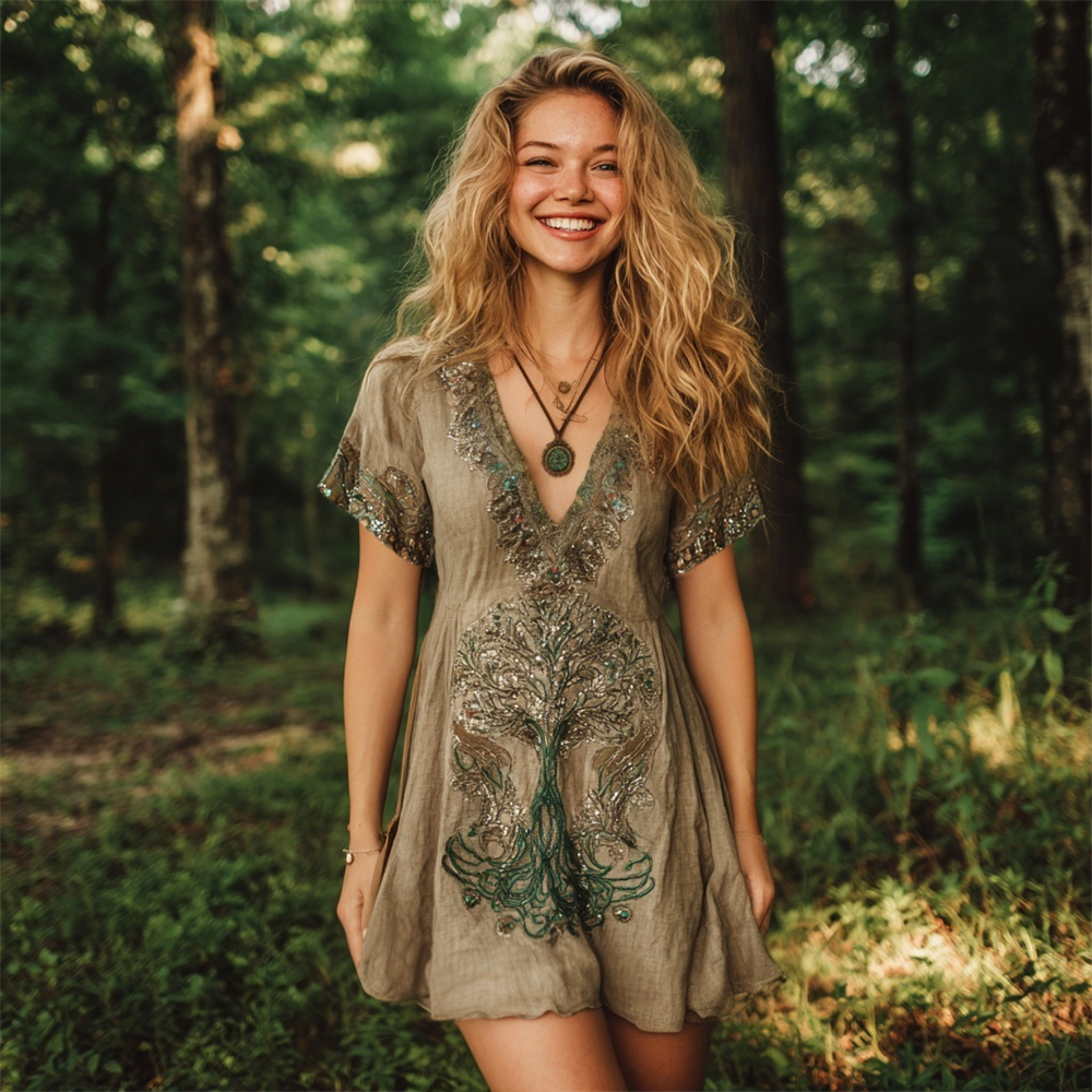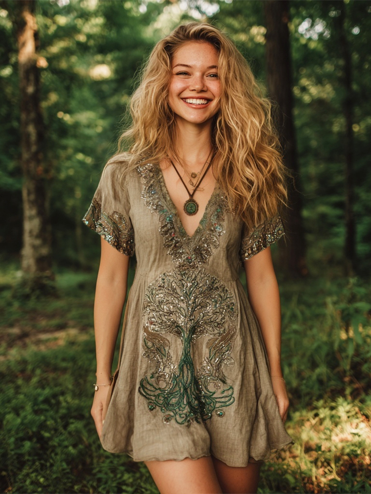 Vintage Sequined Tree Of Life Embroidery Women's Linen V-neck Mini Dress