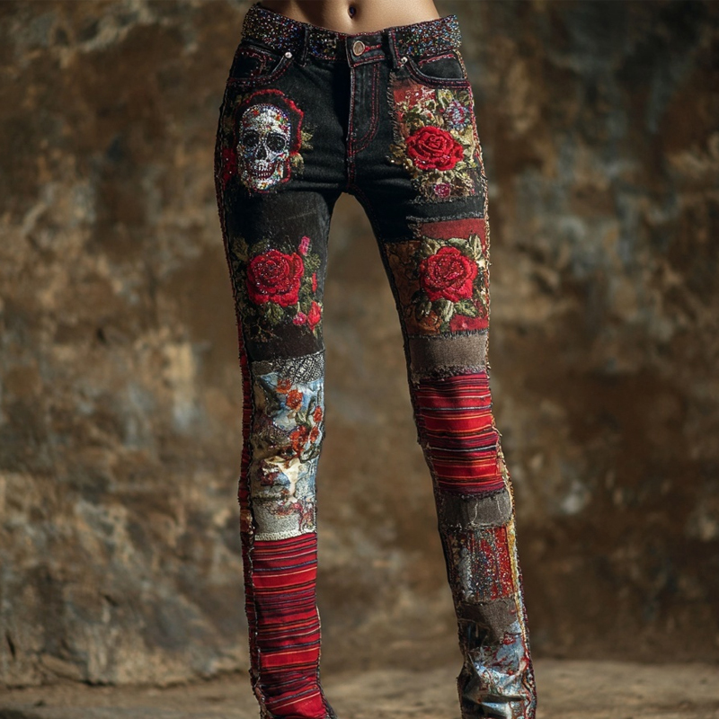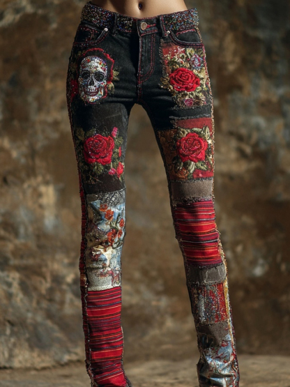 Vintage Skull & Roses Embroidered Patchwork Skinny Jeans