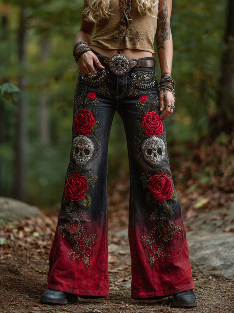 Vintage Skull & Roses Gradient Embroidered Art Skinny Jeans