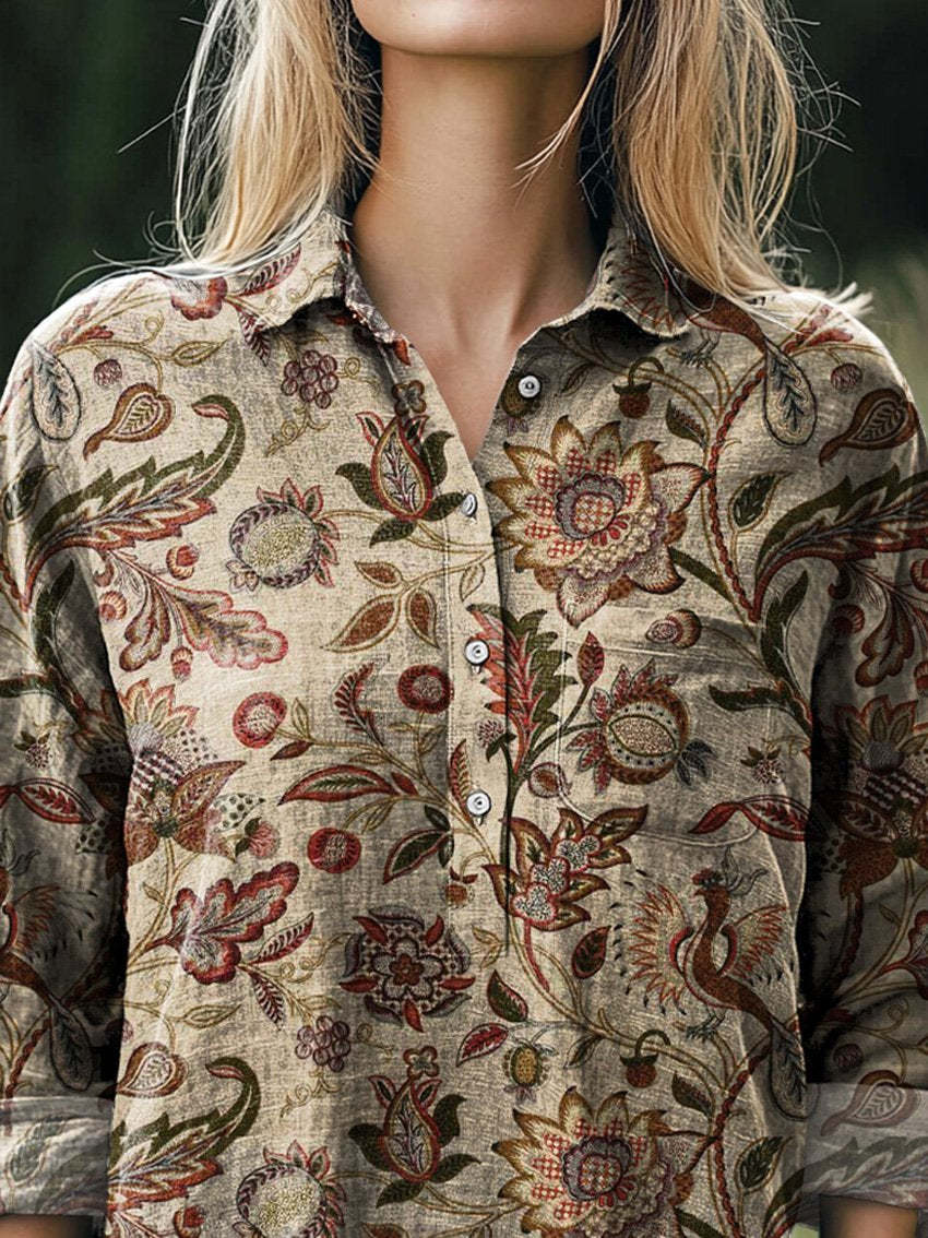 Vintage Spring Floral And Vine Pattern Printed Women's Casual Cotton And Linen Shirt