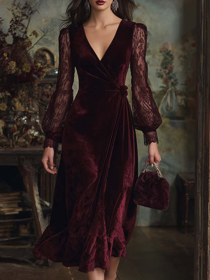 Vintage-style Exquisite Burgundy Velvet Lace Long-sleeved Maxi Dress