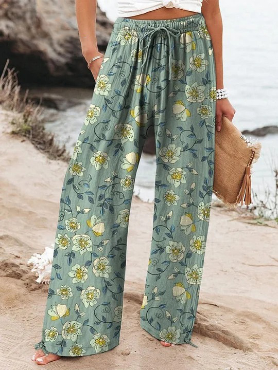 Vintage Style Summer Floral And Vine Pattern Printed Women's Cotton And Linen Casual Pants
