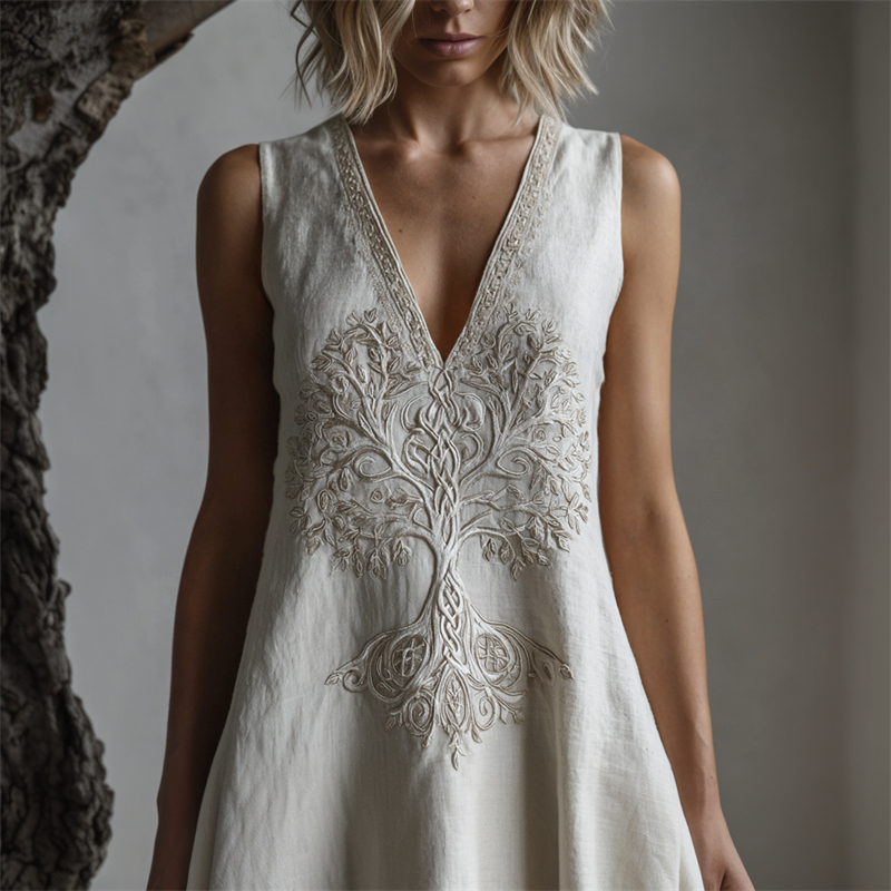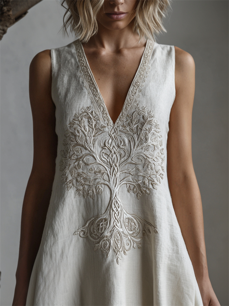 Vintage Tree Of Life Celtic Embroidered Linen Tank Dress