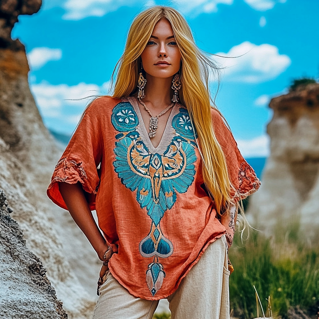 Vintage Tribal Sheep Head Embroidery Art V-neck Linen T-shirt